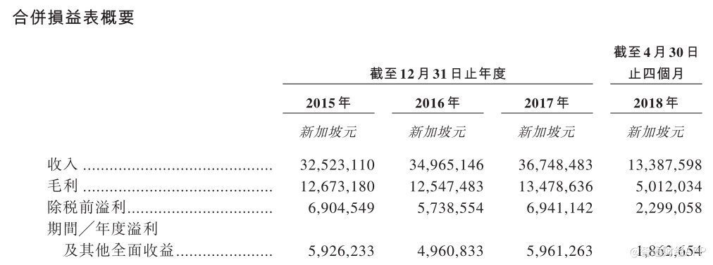 公司2015至2017年12月31日止3个年度整体毛利分别为0.127亿新加坡元,0.125亿新加坡元,0.135亿新加坡元。由截至2015年12月31日止年度的0.127亿元下跌约1.6%至2016年0.125亿元,与期间毛利率从约39.0%下跌至约35.9%一致。由截至2016年12月31日止年度约0.125亿元上升8%至2017年0.135亿元,与期间毛利率从约35.9%上升至约36.7%一致。公司整体毛利截至2018年4月30日止4个月保持稳定,约为0.05亿元,而期间整体毛利率约为37.4%。