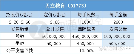 智通财经APP获悉,7月11日,民办教育提供商天立教育(01773)配售结束。本次配售招股价区间为2.26-2.66港元,最终定价2.66港元,每手2660港元。