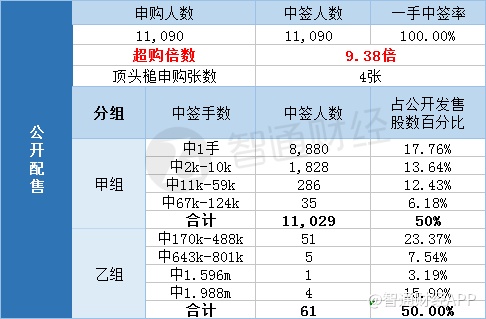 其中,公开配售申购人数11090,一手中签率100%,超购倍数9.38倍。