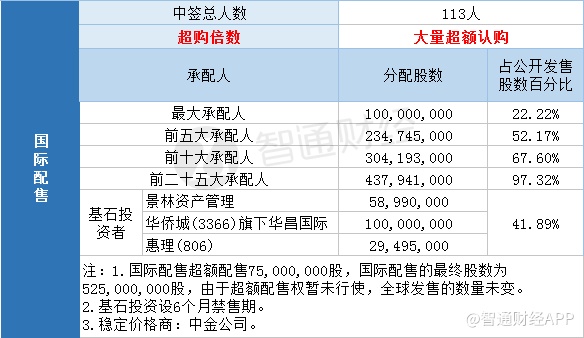 国际配售申购人数113,有大量超额认购。