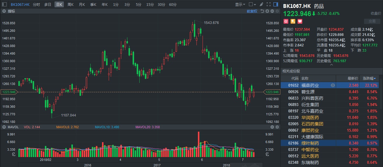 而受宏观政策冲击,A、H两市的医药板块出现回调。截至7月11日收盘,A股医药指数跌近1个点;H股的药品板块微跌0.47%,基本上靠新股福森药业(01652)的22个点在支撑,多只细分领域的龙头均挂绿。