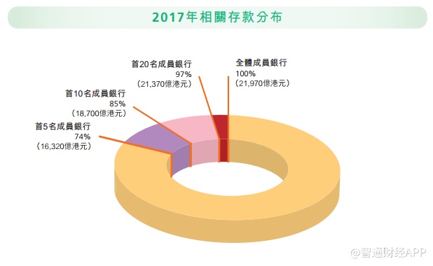 根据成员银行的申报,2017年相关存款总额为 21970 亿港元,较2016年的 20260 亿港元增加8%。主要源于存放于成员银行的相关存款总额上升。成员银行之间的相关存款分布与2016年相当,前20名成员银行(大部分为零售银行)佔业内相关存款总额97%。