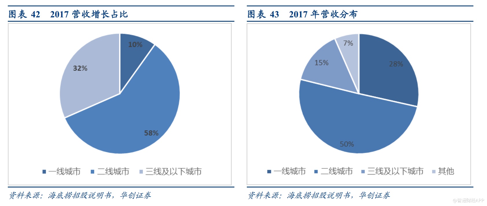 华创指出,海底捞门店下沉成果显著,2017年二三线城市贡献门店增量的87%,营收增量的90%,核心数据表现亮眼。其租金占营业额比重仅为4%,远低于行业8-20%的水平。新门店翻台4.6次,仅略低于老门店的5.1次。单店投入约800-1000万元人民币,新门店1-3个月达到单月盈亏平衡,一般6-13个月完成门店投资回收,高速扩张器的现金流压力大为减轻。