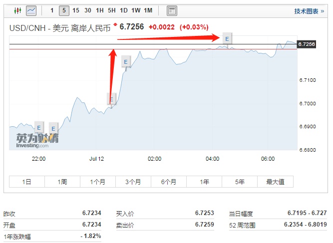 离岸人民币(CNH)兑美元北京时间07:00报6.7256元,较周二纽约尾盘跌738点。