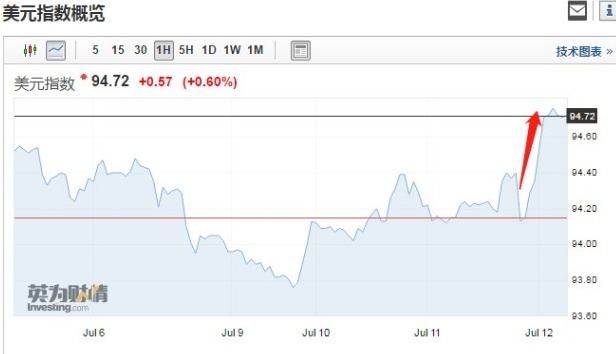 美元指数上涨0.6%至94.72,盘中创下一周新高。
