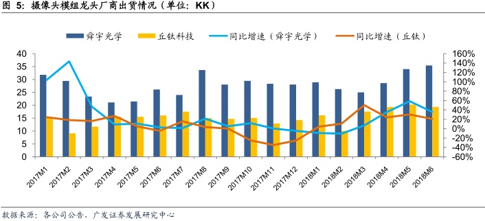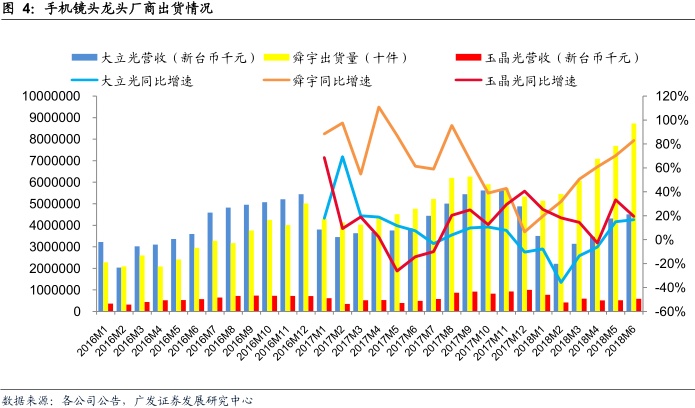 从智能手机光学产业的出货数据来看:大立光与舜宇光学手机镜头6月份出货同比增速(分别为17%和83%)较5月份(分别为15%和70%)继续保持提升,智能手机光学供应链仍保持在较为平稳的运行阶段。