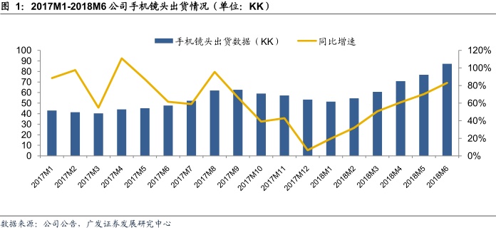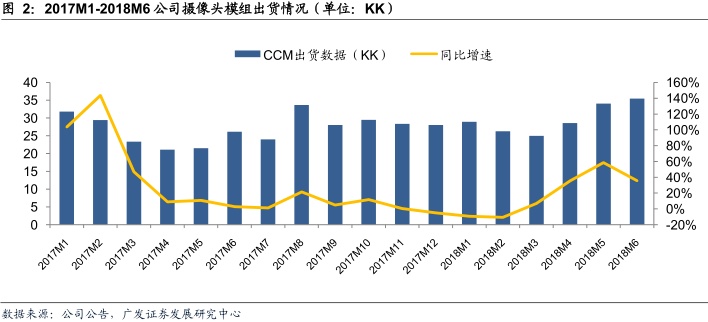 6月份CCM出货35.5KK,同比增长36%,环比增长4%。2018M1-M6累计同比增速为16%,这一数字已达到公司给出的年度指引(15-20%)区间。我们认为当前公司模组的出货增速有望继续保持,届时市场担心的毛利率下滑因素有望被出货量的增加“对冲”,模组的利润增速仍有望达到3月份市场的一致预期。
