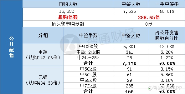 其中,公开配售申购人数15582,一手中签率40%,超购倍数288.65倍。