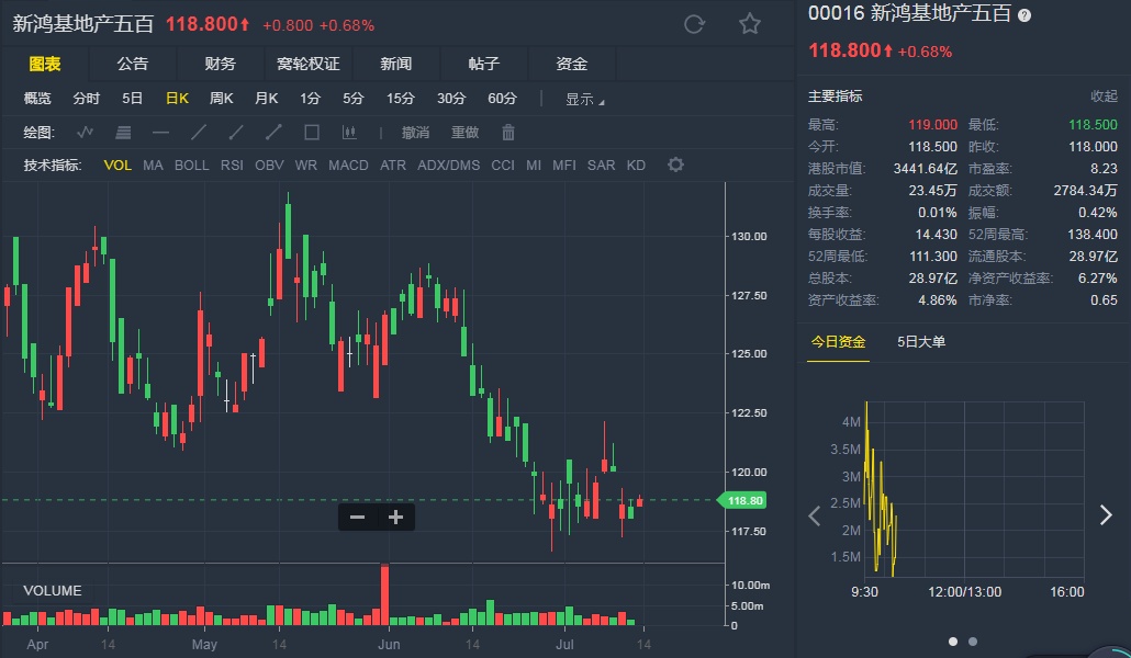 截至7月13日10:19,新鸿基地产涨0.68%,报118.8港元。
