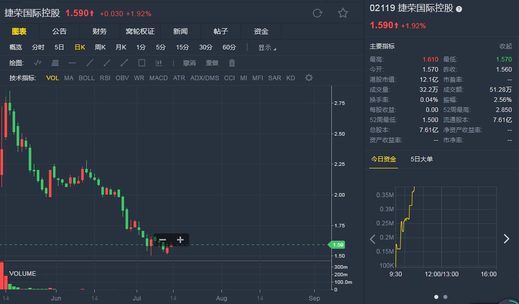 截至7月13日10:33,捷荣国际涨1.92%,报1.59港元。