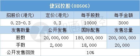 智通财经APP获悉,7月13日,资讯科技服务供应商倢冠控股(08606)配售结束。本次配售招股价区间为0.23-0.3港元,最终定价0.3港元,每手3000港元。