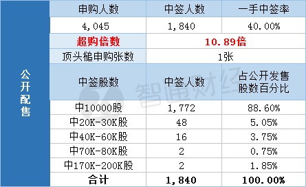 其中,公开配售申购人数4045,一手中签率40%,超购倍数10.89倍。