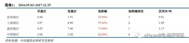 缓慢上行期:如2016年5月3日至2017年12月25日,四大行均表现出缓慢上行的趋势,涨幅排位分别为:建行、工行、农行、中行。