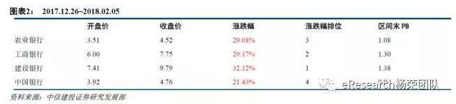 加速上行期:如2017年12月26日至2018年2月5日,四大行均表现出加速上行的趋势,涨幅排位分别为:建行、工行、农行、中行。