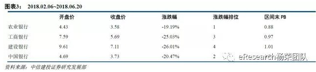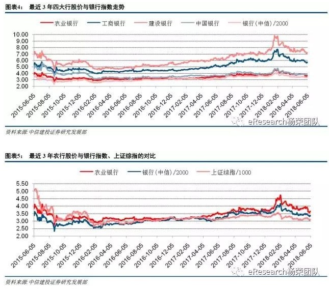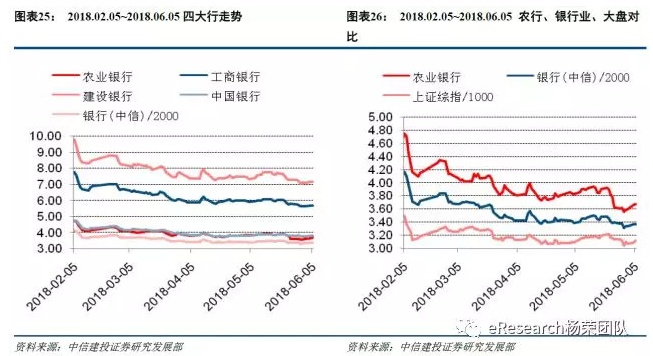 2018年2月5日至2018年6月5日,四大行、银行指数以及上证综指均表现出下行的趋势。例如:在上述4个月的时间内,农行共下跌22.74%,月均跌幅为5.69%(算术平均)。