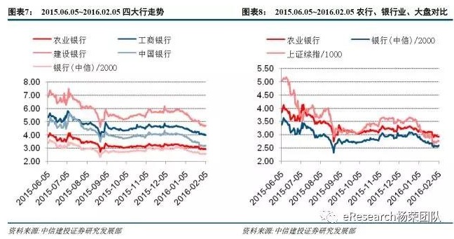 2015年6月5日至2016年2月5日,四大行、银行指数以及上证综指均表现出下跌趋势。例如:在上述8个月的时间内,农行共下跌24.16%,月均跌幅为3.02%(算术平均)。