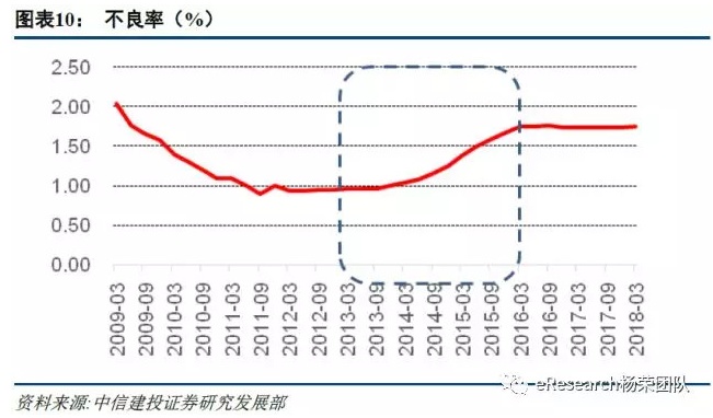 从2013年开始,随着东部沿海城市信用风险的爆发,整个银行业不良率呈现快速上升的趋势,从2013年一季度的0.96%上升至2016年一季度的1.75%。