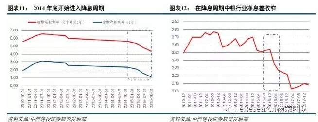 2014年11月22日,央行下调了存贷款的基准利率,下调幅度大25个BP。在随后的一年中,央行又连续5次下调基准利率,每次幅度均为25个BP。对银行来说,贷款利率的调整速度要快于存款市场,因此降息周期中,银行业净息差逐渐收窄,一直持续到2016年底。