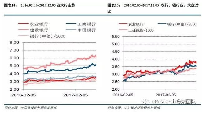 2016年2月5日至2017年12月5日,四大行、银行指数以及上证综指均表现出缓慢上行的趋势。例如:在上述22个月的时间内,农行共上涨30.48%,月均涨幅为1.39%(算术平均)。