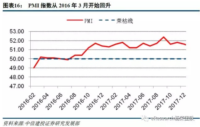 PMI指数自2016年3月回升至枯荣线以上之后,在对应时间段内一直维持在相对较高的水平,表明该段时间宏观经济的景气度相对稳定,为银行业和大盘的缓慢上行打下了基础。