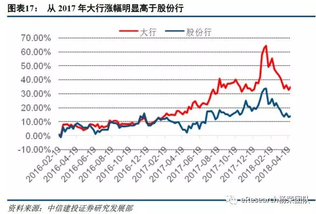 为整治银行业市场乱象,严守不发生系统性金融风险的底线,2017年,银监会组织开展了“三三四十”等系列专项治理行动。受此影响,银行同业负债、同业存单等成本率显著上升,尤其是这两块占比较高的股份行负债压力更大,而大行在负债端拥有较高的存款,成本压力相对较轻。同时,大行在经营策略上比较稳健,风险偏好普遍较低,因此在本轮强监管中影响相对较小。这是导致2017年大行累积涨跌幅高于股份行的核心原因。