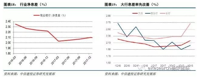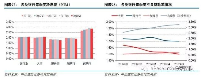 2018年1季度的监管数据表明:行业基本面改善幅度并没有如市场预期的那么强劲,基本面改善中部分指标不达预期。主要是:NIM环比小幅下降2个bp,但主要来自农商行的大幅下降;不良率小幅上升,主要来源于农商行不良暴露加速;净利润增速环比持续下降,18年1季度为4.59%,环比下降1.47%。