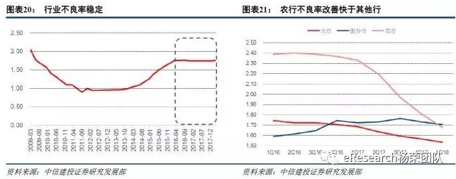 同时由于供给侧结构性改革的持续推进,政策效应显现,大型企业的盈利状况改善更加明显,而小型企业的盈利状况改善不够显著,大型企业是大型银行的客户,而中小企业的主要是股份制等银行的客户。从而大型银行资产质量改善更加显著,不良率持续下降,这也带动大型银行的股价回升。而且农行的不良率改善的程度在大行中改善最为明显,从而股价和估值上都有体现。