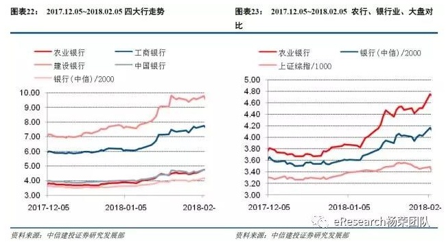 2017年12月5日至2018年2月5日,四大行、银行指数以及上证综指均表现出加速上行的趋势。例如:在上述2个月的时间内,农行共上涨24.67%,月均涨幅为12.34%(算术平均)。