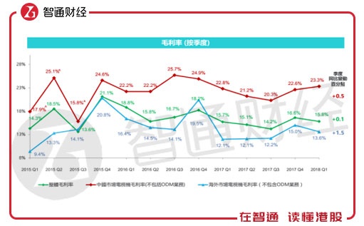 资料显示,自2017年三季度以来,公司中国市场电视机毛利率(不含ODM业务)持续上升,2018年一季度已经提升至23.3%。