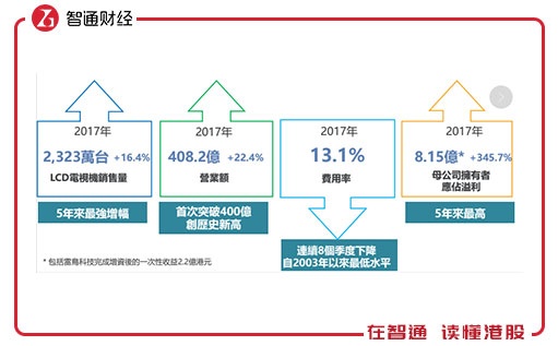 根据TCL电子刚刚发布的盈喜可知,公司在产品毛利率提升的同时也在加强对费用的控制。智通财经APP查阅TCL电子往期财报发现,根据TCL电子2017年年报,公司费用率(即:销售及分销开支及行政支出占营业额比例)较2016年显著下降了2个百分点,这对一家规模性的制造型企业来讲是非常不容易的。