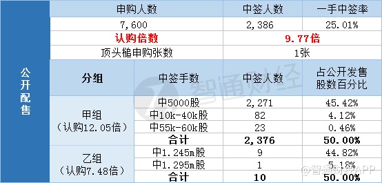 其中,公开配售申购人数7600,一手中签率25.01%,超购倍数9.77倍。