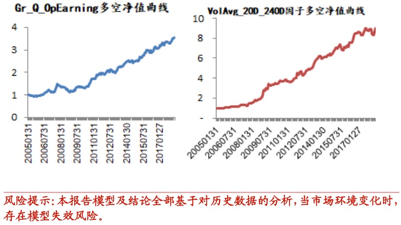 我们构建13个成长因子,从测试结果来看,半年度净利润、营业利润同比增速的指标具有显著的选股能力。以营业利润同比增速为例:IC为0.032,T统计量4.09,多空组合年化收益10.0%,夏普率0.99,选股能力突出。