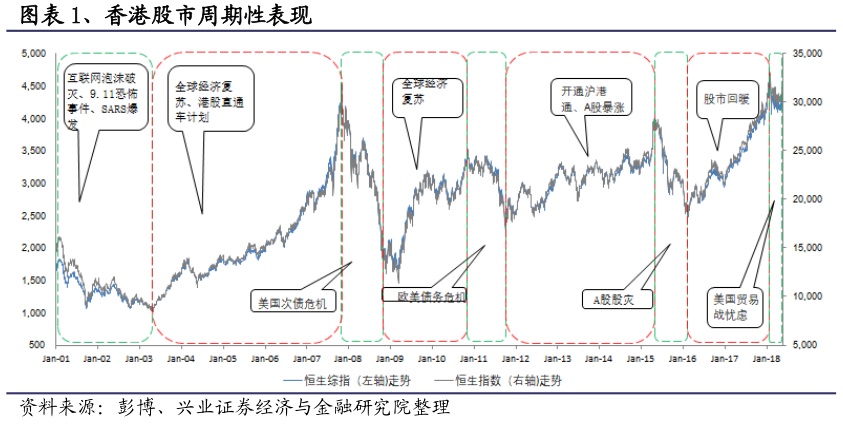 相比于A股不足30年的发展历程,港股却有着近百年的历史。作为成熟市场的代表,仔细观察近20年来香港恒生综指及恒生指数的表现,不难发现其具有明显的周期性特征。每一轮涨跌的背后都有着政治、经济、社会事件的深刻背景:从本世纪初的互联网泡沫、SARS、911恐怖袭击到08年的美国次贷危机、欧债危机、再到近年的沪港通、深港通等等,都在港股市场打下了深深的烙印。