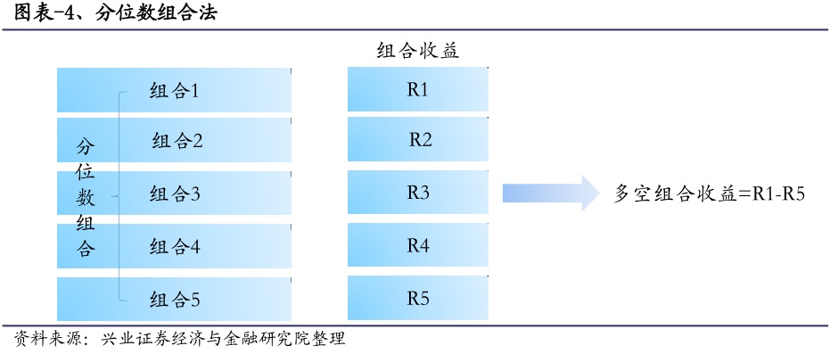 分位数组合测试是一种较为常用的用来衡量因子有效性的方法,如图表-4 所示。首先,按照当期因子值的大小将股票分为 1-5 五个等权的分位组合,组合下期的收益分别为 R1,R2,…,R5,我们根据多空组合的收益 R1-R5 来判断因子的有效性,如果多空组合收益显著异于零则表明该因子是有效的,组合夏普比率越高,表明因子越有效。但是值得注意的是,由于分位数组合法只考虑了多空两个极端组合的收益,而忽略了中间各分位组合的相关信息,因此对因子有效性的刻画上可能存在一定的局限性。