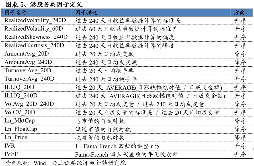 我们构建了 17 个港股另类因子,具体参见图表-5(注意,图表-5 中的方向是根据后续的 IC 测试的结果结合经济逻辑综合判断得来)。