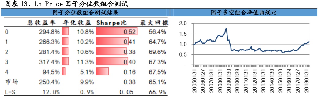 我们针对相对有效的 13 个因子进行分位数组合测试,发现结果并没有想象中的有效。大部分因子的测试结果呈现两个规律:1、各组别之间单调性较为一般;2、尽管首尾组合表现差异较大,但是多空组合测试并不理想。