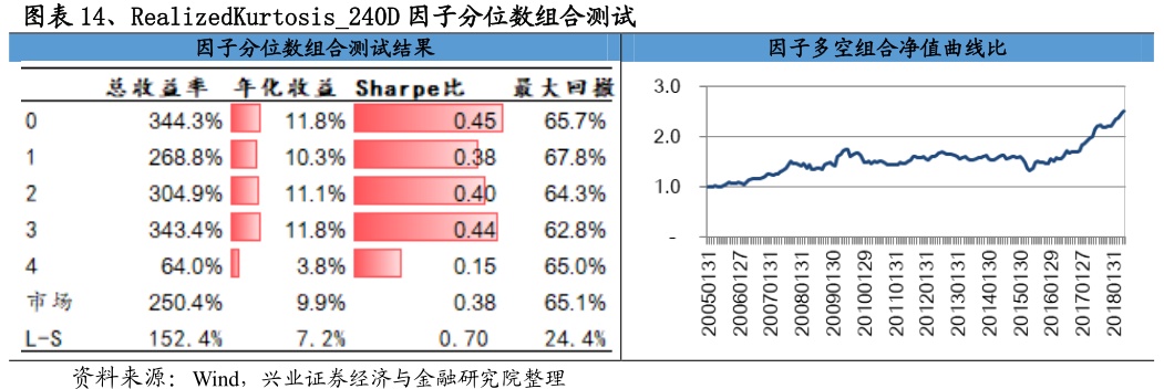 RealizedKurtosis_240D(过去240天日收益率数据计算的峰度)描述的是股票收益率的分布特征。IC测试结果显示该因子与收益率呈现负相关关系,当期因子越小未来收益越大,我们知道峰度越小意味着收益率的分布越接近正态分布,尖峰厚尾的特征越弱,因而相应股票的投机属性也就越弱。分位数组合测试也验证了该因子具有较强的选股能力,多空组合年化收益7.2%,夏普率0.70,具体参见图表-14。