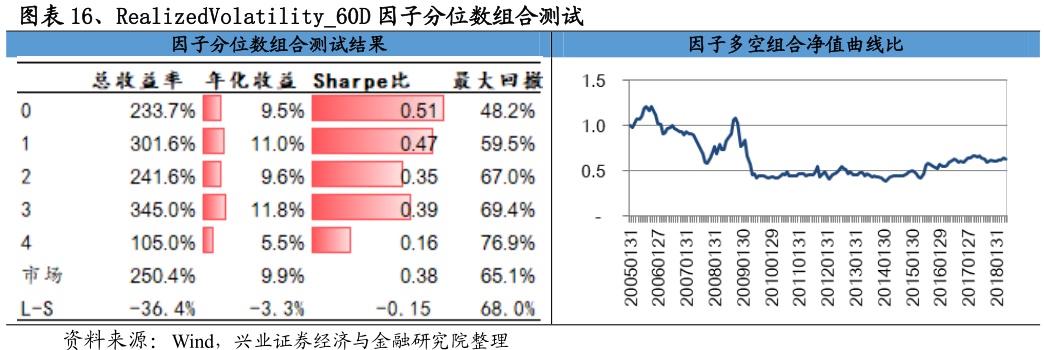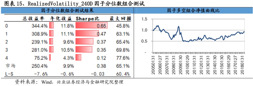 IC和分位数测试的差异主要源于该因子的波动性较大。实际上该因子仅在62%的月份IC为正,在2007年(金融危机前)以及2009年金融危机后的反弹期,因子IC显著为负,这意味着市场在这两个时段由偏好低波动风格切换到偏好高波动的风格,从而导致原来的低波动选股策略在相应月份的组合收益显著降低。