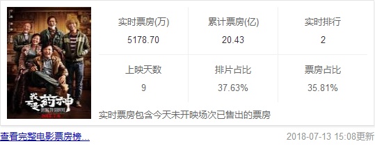 《我不是药神》7月4日前的预售票房就达到1.6亿,7月5日正式上映起就登顶单日票房榜,首映票房1.6亿,7月7日票房提升至3.8亿,累计票房破6亿。7月8日票房累计攻破10亿大关。截至2018年7月13日,该片票房已超过20亿元,距离猫眼给予的40亿预期已经进程过半,而影片关联方早在资本市场上已开始争奇斗艳了。