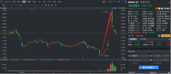作为出品方和发行方的A股公司——北京文化,在大盘明显走弱的时候,从6月22日的9.22元起涨,7月9日达到近期最高的17.18元,12个交易日最大涨幅接近86%,随后股价有所回调,截至7月13日股价为13.22元,仍有43%的涨幅。