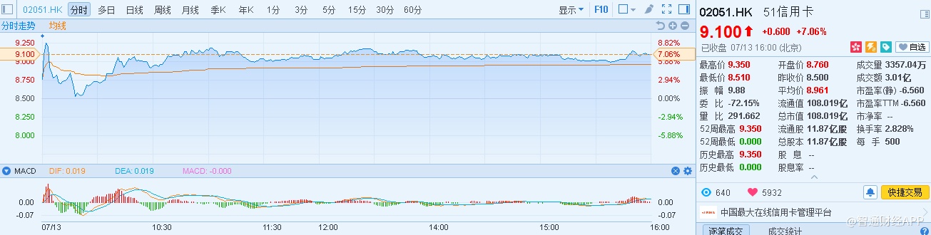 7月13日,51信用卡(02051)在香港交易所主板挂牌上市,公司开盘价8.76港元,较发行价8.5港元上涨3.06%,日内最高涨至9.35,收盘报9.1港元,涨7.06%,全天成交量为3357.04万股,总成交额突破3亿港元,市值达到108亿港元。