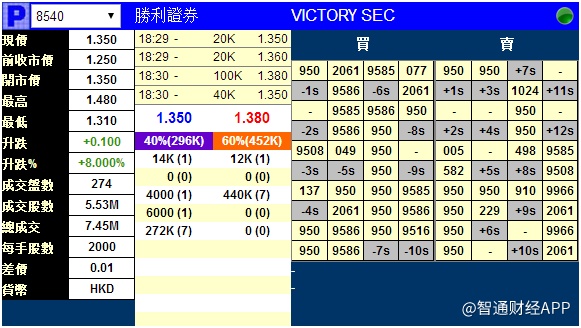 智通财经APP获悉,香港综合证券经纪商胜利证券(08540)将于下一交易日挂牌,上市前夕,据辉立交易场资料显示,胜利证券暗盘开市报1.35元,较招股价1.25元涨0.1元。收报1.35元,较招股价涨8%,每手2000股,不计手续费,每手赚200元。