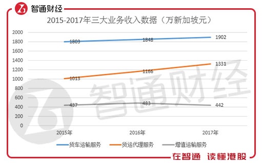 货运代理业务收入由2015年的1013万新加坡元增至2017年的1331万元,年复合增长率14.63%,且该业务收入占总收入的比例由2015年的31.1%上升至2017年的36.5%。货运代理业务能成为新的业绩增长点,主要得益于海路货运代理服务收入的快速增长,2015-2017年,该服务收入年复合增长率16.56%。