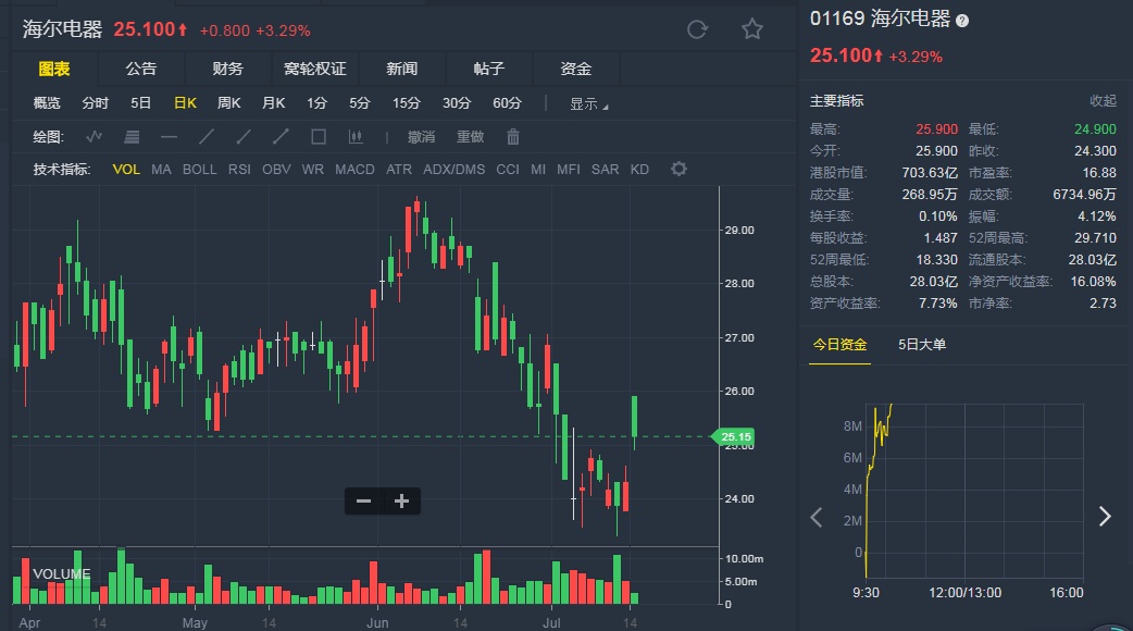 截至7月16日10:12,海尔电器涨3.29%,报25.1港元。