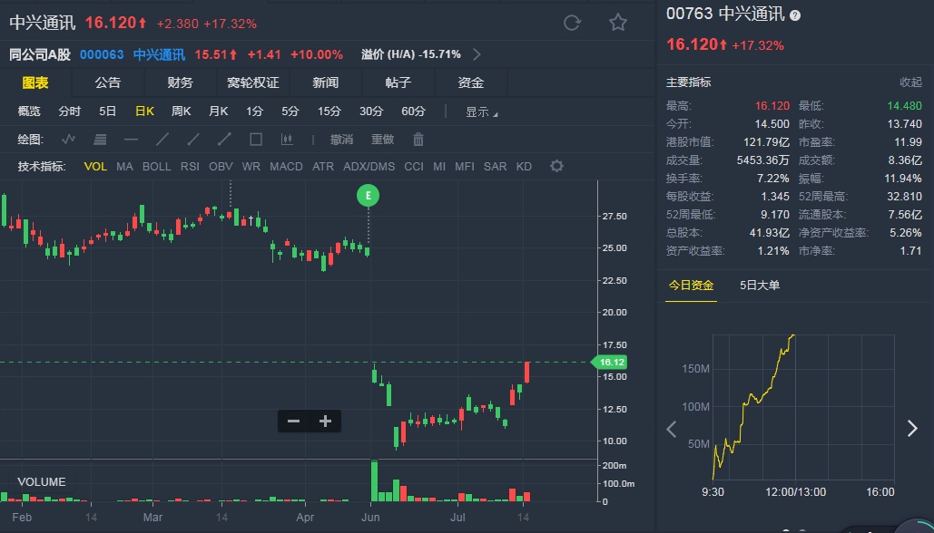 截至7月16日12:06,中兴涨17.32%,报16.12港元。