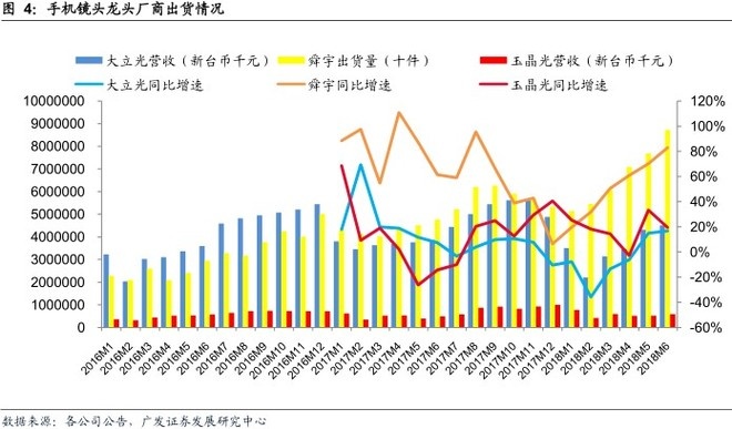 从智能手机光学产业的出货数据来看:6月份,舜宇光学的手机镜头出货量同比大幅增长83%,环比增长13%,大幅高于大立光电当月的营收增速(同比增长17%)。下图表可看出,对比大立光及玉晶光,今年以来舜宇的出货量是同比增速最快的。