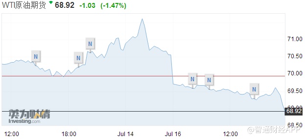 智通财经APP获悉,WTI原油午后跳水,现已跌破69元关口,截至发稿,WTI原油报价68.92,跌1.03或1.47%。