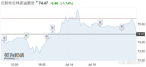 同时,布伦特原油也直线下跌,现报价74.47,跌0.86或1.14%。