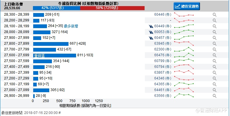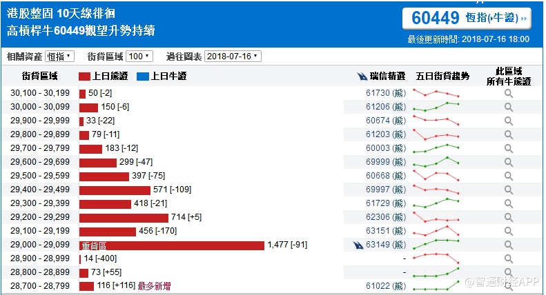 智通财经APP获悉,截至7月16日,恒指最新的牛熊街货比例为42:58。从瑞信恒指牛熊证街货分布图中得到的数据显示,熊证街货重货区在29000-29099区间,此区间最新的熊证数量为1477张,比上一交易日减少91张,最多新增在28700-28799区间,此区间最新的熊证数量为116张,比上一交易日增加116张。牛证中重货区在27600-27699区间,该区间最新牛证数量为811张,比上一交易日减少103张;最多新增落在28100-28199这一区间,新增35张。