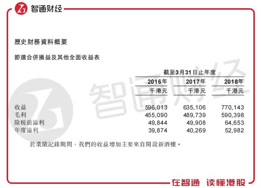 招股书显示,首沣控股2016年至2018财年的营收分别达到5.95亿元、6.35亿元和7.7亿元,近三年年度溢利分别为3987.4万元、4026.9万元和5298.2万元。其中,2018财年集团的营收及溢利均实现2成以上的增长,集团收益增加主要来自开设新酒楼。